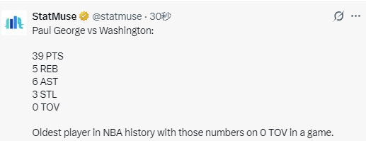 根据数据统计显示,单场39分,是乔治本赛季得分新高,同时也是他在76人生涯的单场最高分。乔治此役在0失误的情况下砍下39分5篮板6助攻3抢断,也是NBA历史上能拿到上述数据的最老球员。