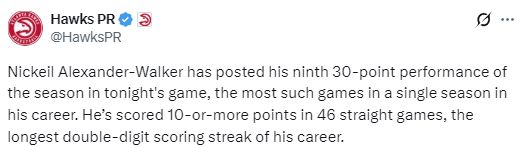 此外,本场比赛还是沃克连续第46场比赛得分上双,同样刷新个人生涯最长连续得分上双纪录。凭借本场比赛命中的5记三分球,沃克还追平了2021-22赛季的特雷-杨,成为老鹰队队史单赛季命中三分球第二多的球员。