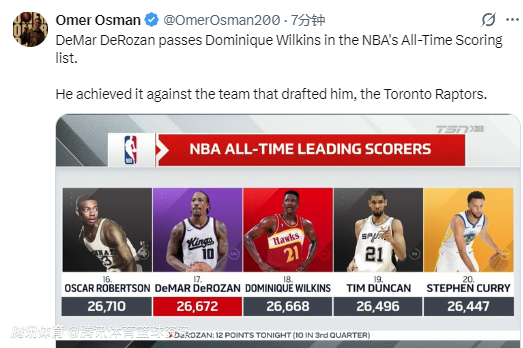 2026-04-02 10:10北京时间4月2日,NBA常规赛继续进行,国王队对阵猛龙队。此役进行到第三节,德罗赞迎来里程碑,他的生涯总得分超越多米尼克-威尔金斯(26668分),升至NBA历史第17位。