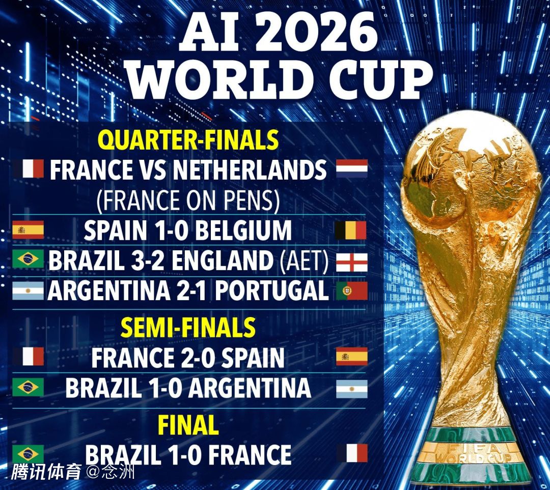 AI预测世界杯:巴西1-0法国夺冠!熊皇金球奖 梅西亲手淘汰C罗
