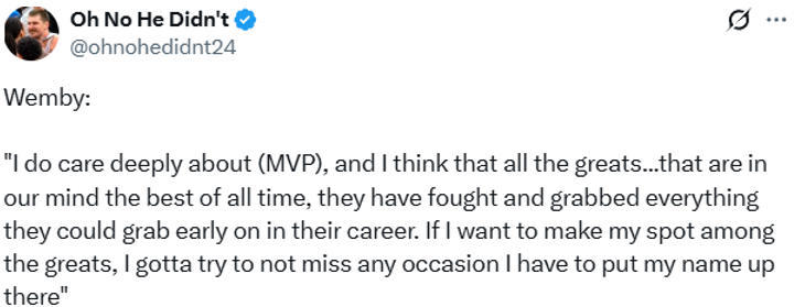 在谈到MVP的竞争时,文班亚马说道:“我确实非常在意(MVP这个奖项),而且我认为,所有那些我们心目中的传奇巨星、历史最佳球员,他们都在职业生涯早期奋力拼搏,抓住了一切能抓住的机会。如果我想在传奇球星中占据一席之地,就必须尽力不错过任何一个让自己跻身前列的机会。”