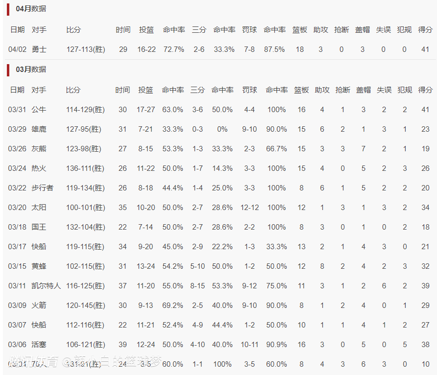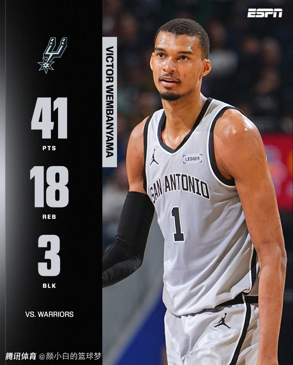 上一场对阵公牛的比赛,文班亚马30分钟,27中17,三分6中3,拿到41分16篮板4助攻1抢断3盖帽,连续两战拿到82分34篮板。