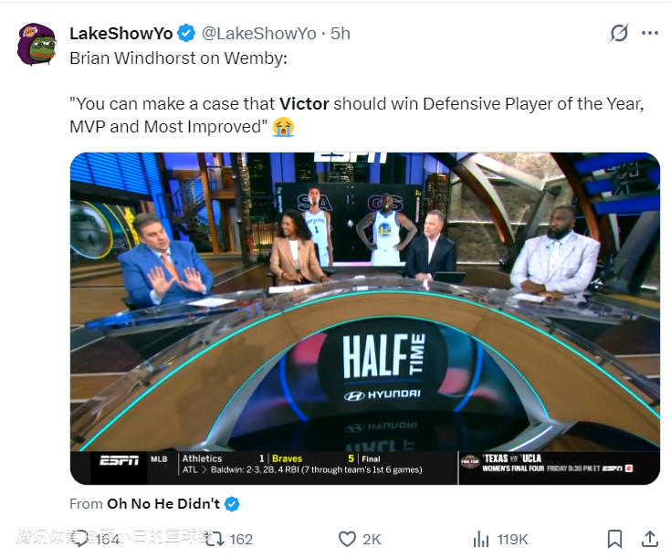 ESPN记者布莱恩-文霍斯特在评价本赛季的文班亚马时,他表示,本赛季的wemby有希望同时拿到最快进步球员、最佳防守球员、最有价值球员,也就是三王合一。