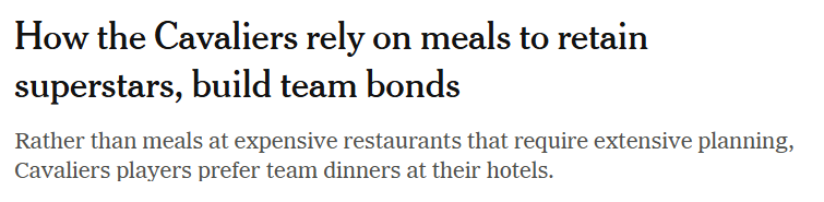 每一次骑士客场之旅,包括正在进行的这一趟,球队都会为整支出行团队包下入住五星级酒店的顶级主厨,至少提供两顿正餐,而且不只面向球员