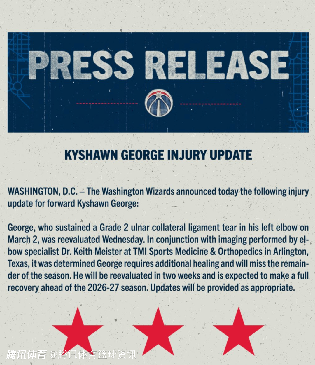 2026-04-03 01:10北京时间4月3日,奇才官方宣布,凯肖恩-乔治左肘尺侧副韧带二级撕裂,赛季报销。