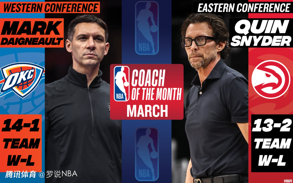 雷霆队主帅马克-戴格诺特当选西部3月最佳教练,老鹰队主帅奎因-斯奈德则斩获东部该项荣誉。