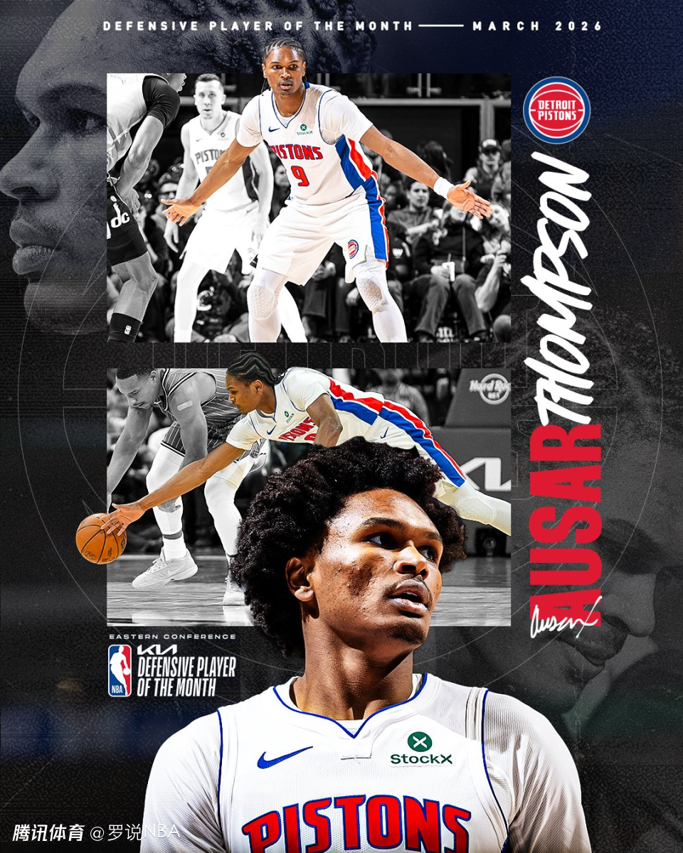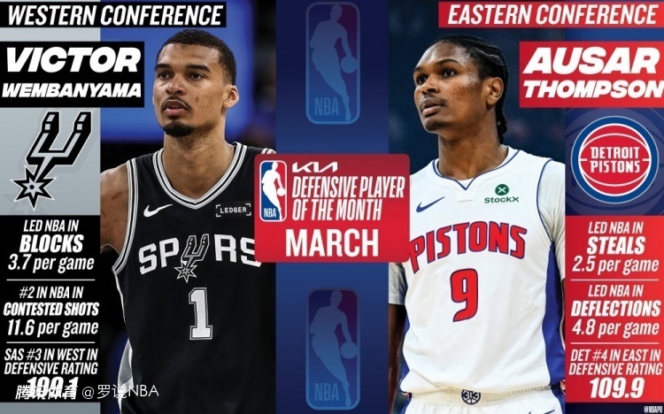 文班亚马是本赛季唯一一位三次当选月最佳防守球员的球员;活塞锋线奥萨尔-汤普森则与他一同成为本赛季仅有的两位多次获此奖项的球员——汤普森也当选了3月东部最佳防守球员,他曾在一月拿下过东部月最佳防守球员。