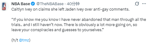 2026-04-03 06:30北京时间4月3日,前公牛球员杰登-艾维因发表争议言论被球队裁掉后,声称妻子凯特琳自此便不再与他联系。如今,凯特琳终于打破沉默,公开驳斥丈夫的说法,称这是一个谎言。