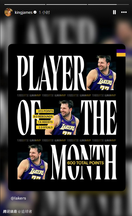 力压KD文班!东契奇单月600分再获大奖 詹姆斯转发海报祝贺他