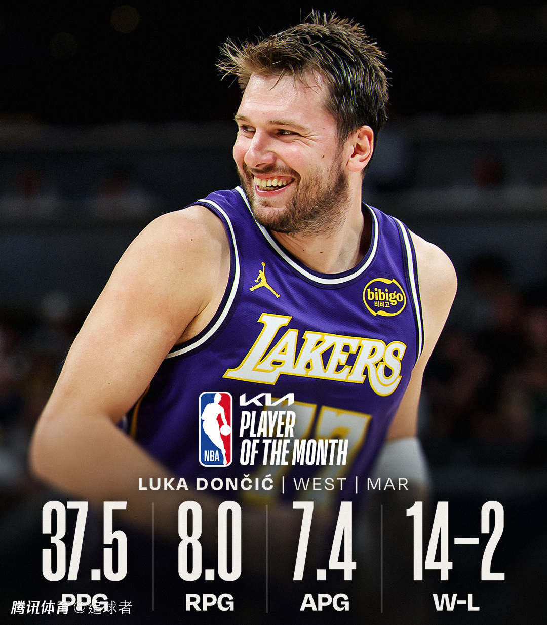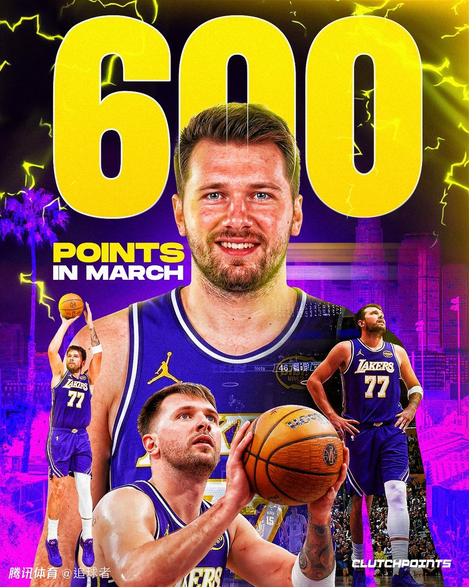 在三月份,东契奇带领湖人拿到15胜2负的骄人战绩,单月轰下600分成为NBA历史上第十位单月至少600分的球员,场均爆轰37.5分8.0篮板7.4助攻2.3抢断,期间东契奇连续13场30+,7场40+以及2场50+,更是在对阵热火时爆砍60分。