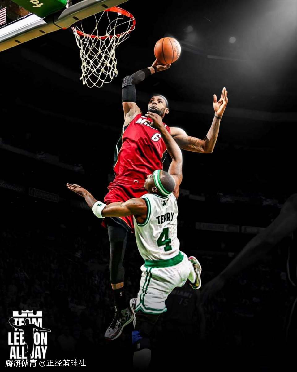 排在第二位的,是他在波士顿客场隔扣杰森-特里的经典瞬间。2013年,热火客场挑战凯尔特人,当时绿军手握领先优势,韦德抢断后发起快攻,经队友传导后,詹姆斯接到空中传球,在罚球线外起跳,隔着防守的特里完成残暴隔扣,甚至将对手扣翻在地。