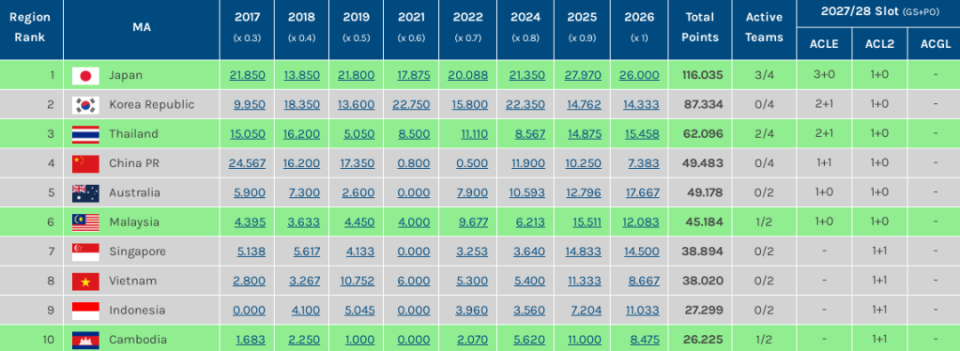 昔日能与日韩掰手腕的东亚区“第三联赛”,随着“亚战”成绩暴跌,联赛地位一降再降。2028年法甲只是可能失去“五大联赛”地位和少1个欧冠名额,中超却可能彻底无缘亚冠精英联赛,在东亚区排名跌出前六名。