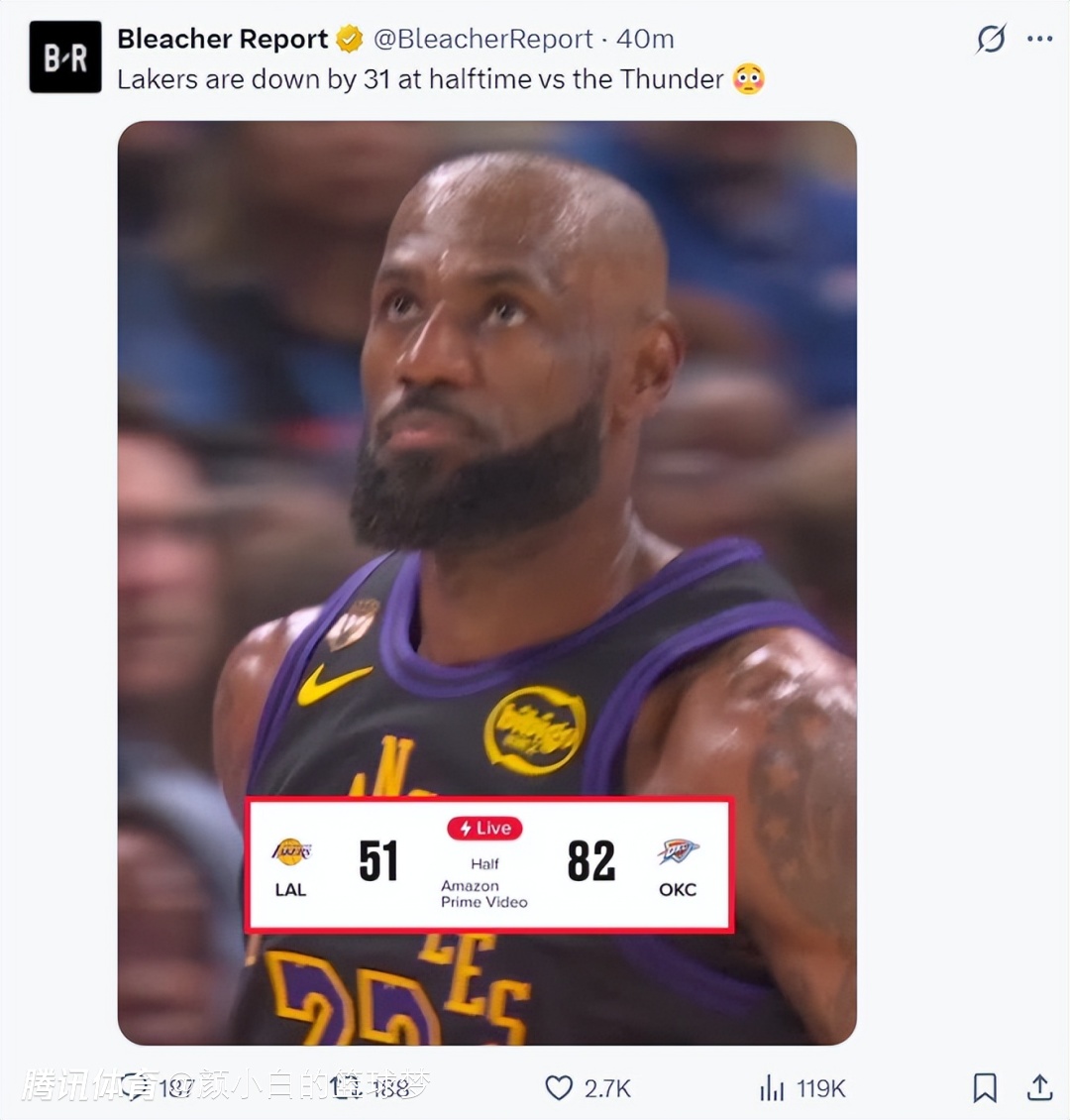 但上半场打完詹姆斯在场-30湖人最差,东契奇在场-24,八村垒在场-23,这让黑子们各种炮轰老头子。在半场结束时詹姆斯进入球员更衣室也是低着头,他非常沮丧。半场让雷霆拿82分实在是太惨。