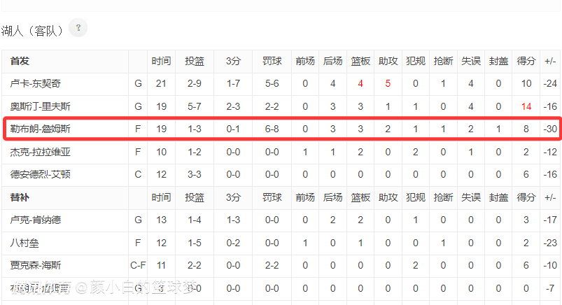 詹姆斯第三节4中2拿到5分3篮板,末节因为分差太大他直接作壁上观了,全场比赛26分钟,7中3+三分4中1,罚球8中6,拿到13分6篮板2助攻1抢断1盖帽,命中率42.9%,三分命中率25%,真实命中率61.8%,正负值-37。