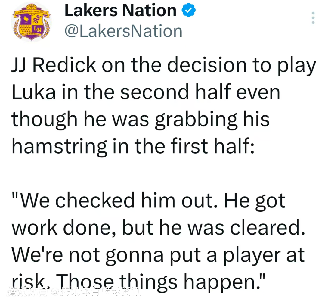 雷迪克谈及即便东契奇上半场就捂着腿筋,仍决定让他下半场出战时表示:“我们给他做了检查,也做了处理,他通过了健康评估。我们不会让球员冒风险上场,这种情况在比赛里很常见。”