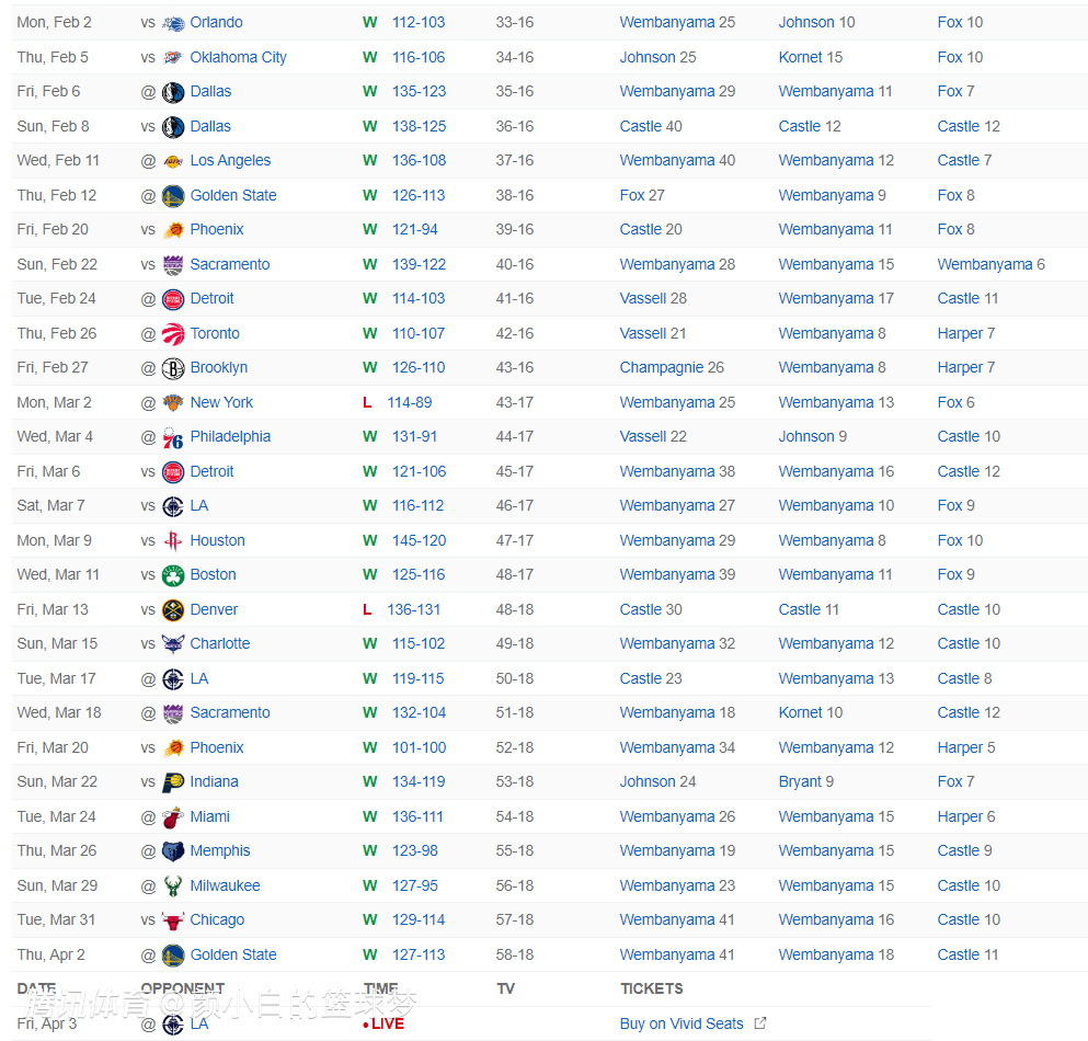 2026-04-03 13:10北京时间4月3日,NBA常规赛,马刺大胜快船拿到11连胜,最近的29场比赛马刺赢下其中的27场。这场比赛马刺最多领先快船26分,虽然快船一度追到个位数,末节马刺又一波流拉开分差,没有文班亚马也拿到背靠背胜利。
