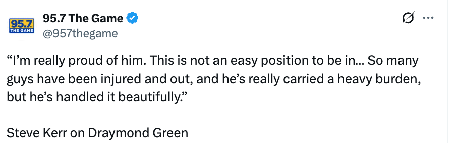 谈及追梦,科尔表示:“我真的为他感到骄傲。他所处的位置并不轻松…… 队里太多球员伤伤停停,他真的扛起了沉重的担子,把一切都处理得非常出色。”