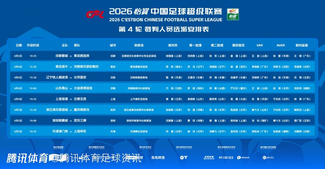 2026-04-03 13:50北京时间4月3日,围绕中超联赛第4轮裁判安排,引发关注的不只是具体人选,还有执法方式的变化。消息显示,中国足协已在本轮开始试行“视频裁判集中执法”新模式。