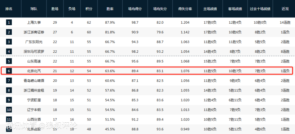 但截止目前,北京战绩只有21胜12负,排在积分榜第六位,以新赛季初就喊出争冠的层面,肯定是未能达到预期。