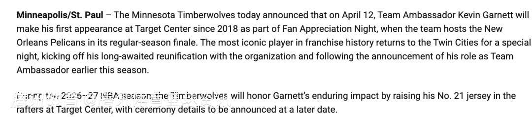 2026-27赛季,森林狼将为表彰加内特留下的深远影响,在标靶中心球馆上空退役他的21号球衣,相关仪式细节将在日后公布。