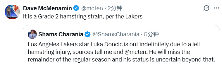 2026-04-04 06:10北京时间4月4日,名记Shams报道称,湖人球星东契奇因左腿筋伤势无限期缺阵。他将缺席本赛季剩余所有常规赛,此后的出战状态目前仍无法确定。随后湖人官方宣布,东契奇确诊为腿筋二级拉伤。此前医学专家表示,一级拉伤需要1-2周康复,若是二级拉伤就要3-6周。