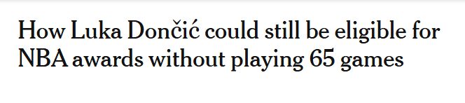 湖人记者DanWoike报道称,东契奇或可以通过申诉获得赛季评奖资格。根据NBA的65场出战规定,若球员满足一系列条件,可申请“特殊情况豁免”,其中包括因“特殊情况”导致“该球员在赛季中无法参加一场或多场常规赛”。