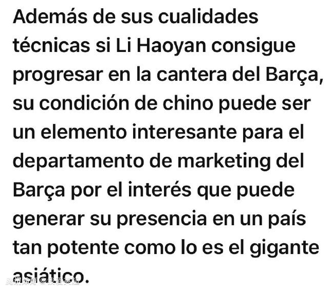 这家西媒还直言,除竞技层面外,如果李昊炎能够在巴萨青训体系中持续成长,其中国背景也可能在市场层面带来额外价值,尤其是在亚洲市场的关注度方面。