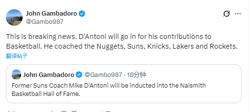 2026-04-04 08:00北京时间4月4日,据太阳队记John Gambadoro爆料,前太阳队主帅迈克-德安东尼将入选奈史密斯篮球名人堂。