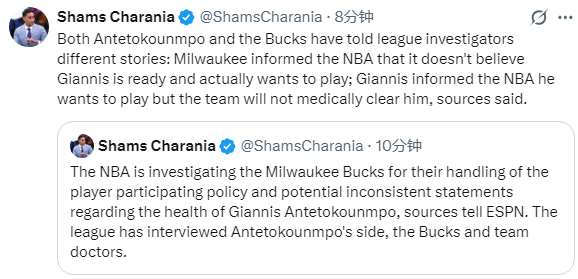 据名记Shams报道,联盟正在调查雄鹿处理球员参赛政策的方式以及关于字母哥健康状况声明的潜在矛盾;联盟已经访问了字母哥、雄鹿和队医三方。
