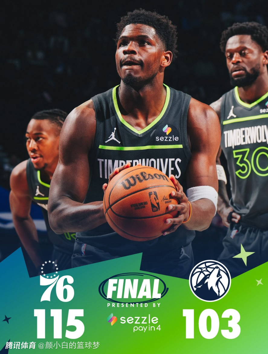 2026-04-04 10:50北京时间4月4日,NBA常规赛,费城76人115-103击败森林狼,本赛季费城双杀森林狼。此役爱德华兹复出打了26.2分钟,但他在场-14是全队第二差,他被马克西打得满地找牙,华子疑似沦为卧底。