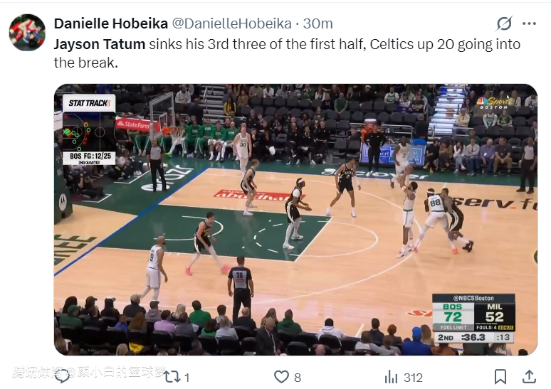 第二节的塔图姆手感有所下滑,单节7中2+三分5中1拿到5分2篮板3助攻2抢断,半场已经拿到14分5篮板8助攻的全面数据,上半场布朗则拿到13分,双探花继续闪耀。