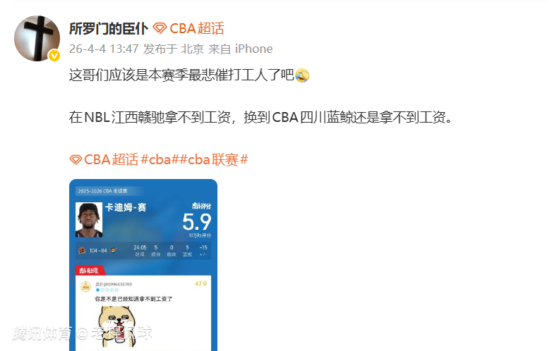 “这哥们应该是本赛季最悲催打工人了吧?在NBL江西赣驰拿不到工资,换到CBA四川蓝鲸还是拿不到工资。”该博主在社媒上写道。