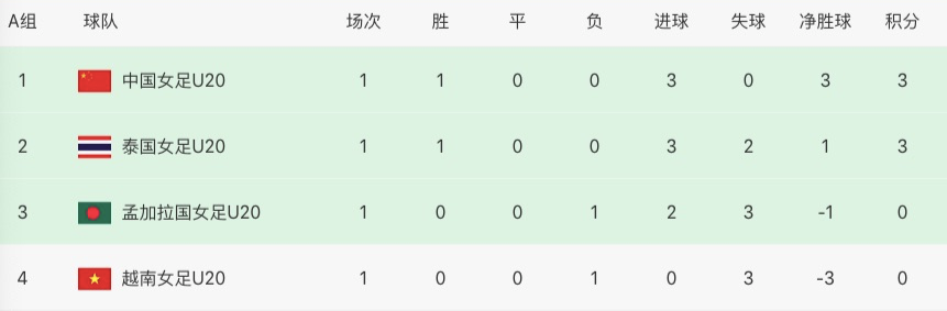 首轮比赛,中国U20女足以3-0完胜越南队,上半场,郑璐梅开二度。下半场,曾雨佳补射破门。同组首轮另外一场比赛,泰国队3-2险胜孟加拉国队。首轮战罢,中国女足与东道主泰国女足都是同积3分,但中国女足凭借净胜球优势在本组暂列头名。