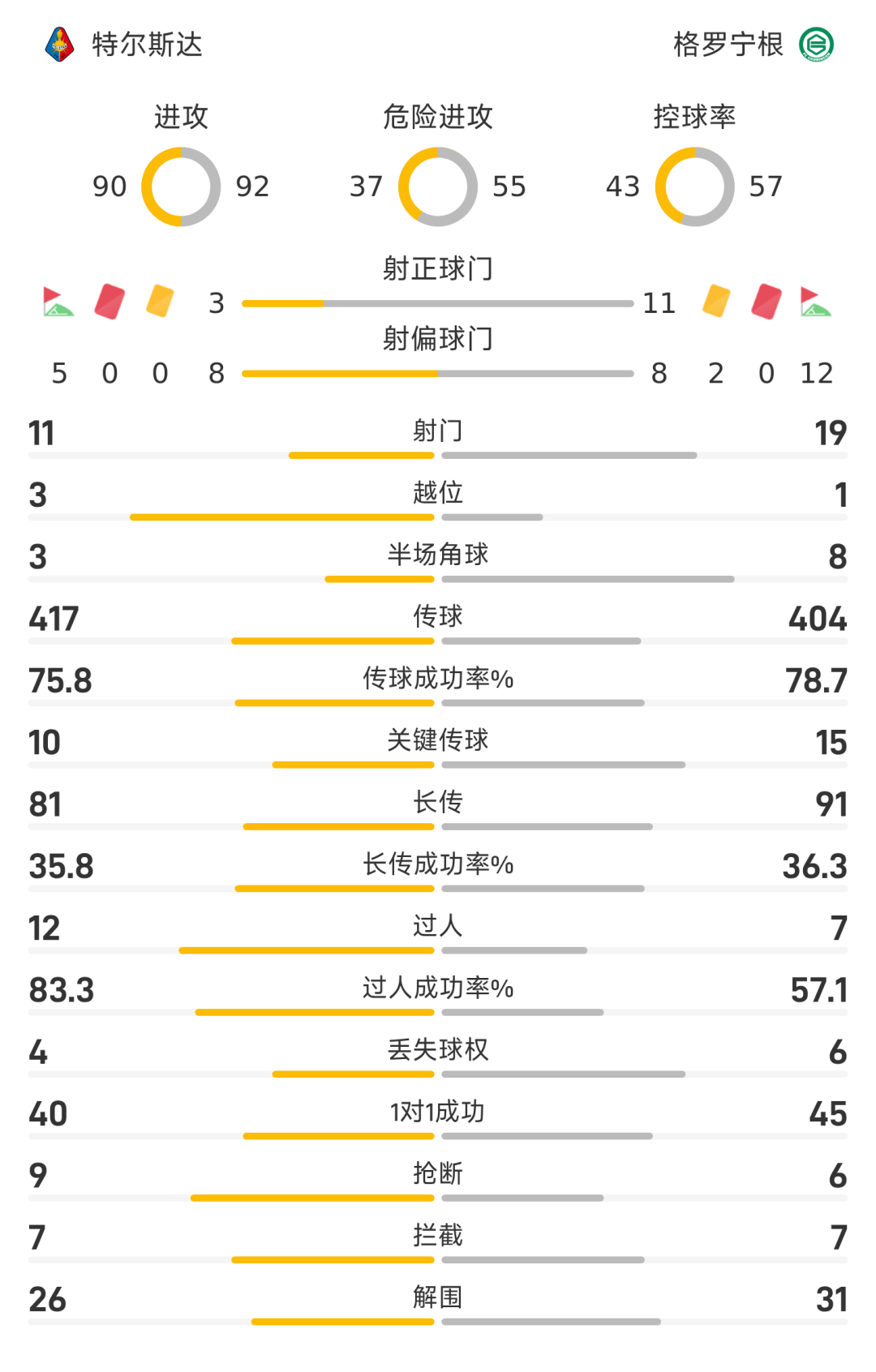 格罗宁根首发阵容:1-瓦森、43-皮尔斯曼、5-伦特、3-布洛克齐尔、4-詹斯、8-德容格、10-塔哈、14-施罗德、18-兰德、17-范德沃夫(70’9-威鲁姆松)、26-范伯根