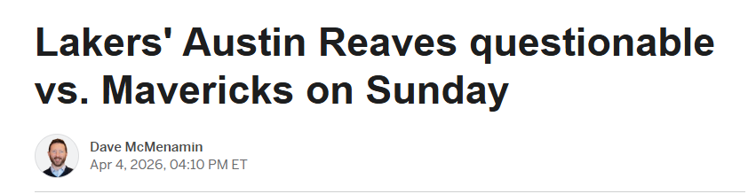 2026-04-05 05:00北京时间4月5日,湖人刚遭遇东契奇左腿筋拉伤、无限期缺阵的打击,湖人主帅雷迪克又在今日表示,里夫斯对左侧腹斜肌/肋部区域进行了核磁共振检查,这位得分后卫能否出战周一对阵达拉斯独行侠的比赛尚存疑问。
