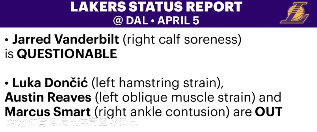 2026-04-05 06:20北京时间4月5日,NBA常规赛继续进行,湖人明日对阵独行侠。赛前,湖人方面公布球队本场比赛伤情报告,东契奇、里夫斯和斯马特三人将缺阵。