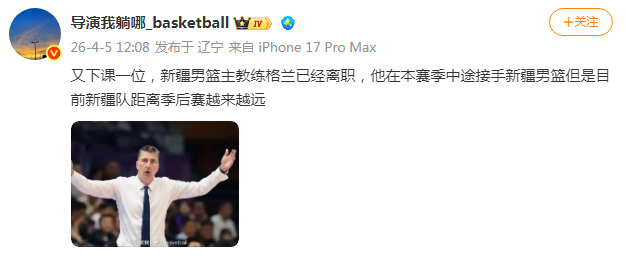 2026-04-05 13:20北京时间4月5日,在赛季初刘炜因为战绩不佳离队后,如今根据媒体人导演我躺哪报道,新疆男篮新任主教练格兰也已经离职。新疆男篮赛季未打完已经两人主帅离任,而球队只有倒数第四战绩距离季后赛越来越远。