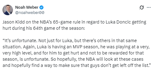 谈及NBA65场出战规定及东契奇在个人赛季第64场比赛中受伤的情况,基德表示:“这很遗憾。不只是东契奇,还有其他球员也面临同样的情况。东契奇本赛季打出了MVP级别的表现,竞技状态极其出色,却因受伤无缘获得相应荣誉,实在令人惋惜。希望联盟能审视这类情况,想办法避免这些球员被排除在评选名单之外。”