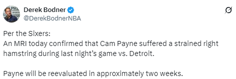2026-04-06 06:30北京时间4月6日,76人官方更新球队伤情,今日经核磁共振检查(MRI)确认,后卫佩恩在昨晚对阵活塞的比赛中遭遇右腿腿筋拉伤,将在约两周后接受复查。
