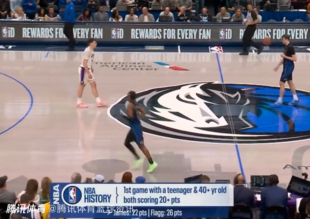 上半场战罢,詹姆斯首发出战17分钟,投篮11中9,三分球1中1,拿到22分1篮板4助攻,在里夫斯、东契奇缺席的情况下,以一己之力扛起了球队。独行侠这边,弗拉格也有着出色发挥,首发出战20分钟,投篮16中9,拿到26分5篮板4助攻。据统计,这是NBA历史首次40+球员和青少年球员(未满20岁)同场比赛半场均拿到20分。