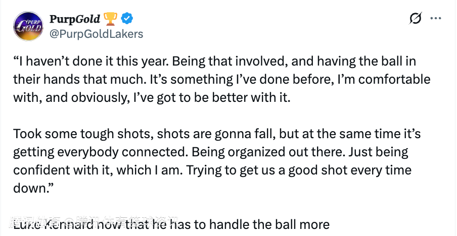 谈到自己增加持球任务后的感受,肯纳德表示:“本赛季我很少这么做。这么深度地参与持球、掌控球权,这事儿我以前做过,本身并不陌生,但显然我还得做得更出色。今晚投丢了一些高难度球,投篮手感有起伏很正常,但同时我要把全队的进攻串联起来,把场上的节奏梳理清晰。我现在对自己的角色很有信心,目标就是每次进攻都能为球队拉扯出好机会。”