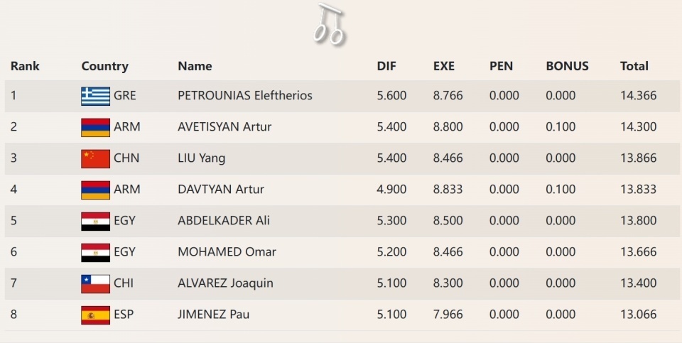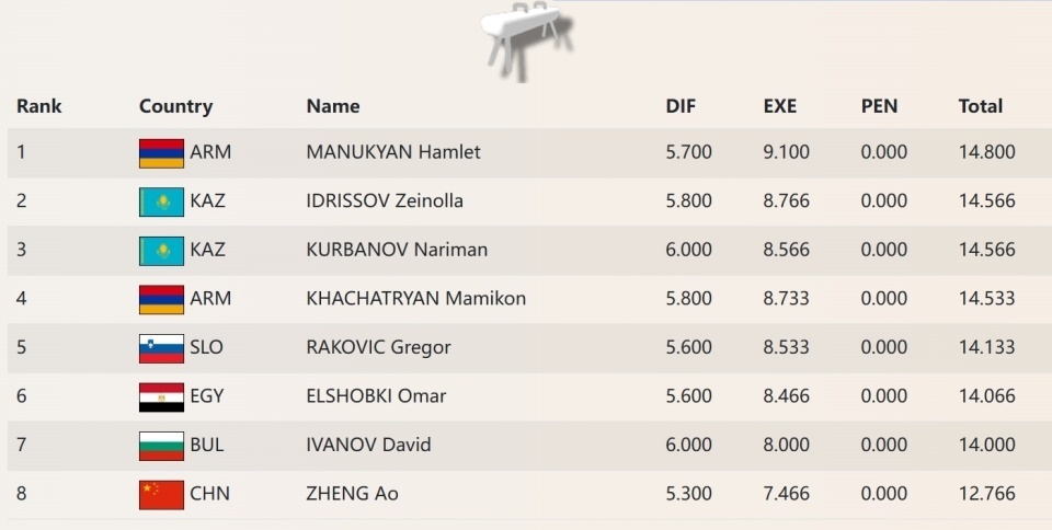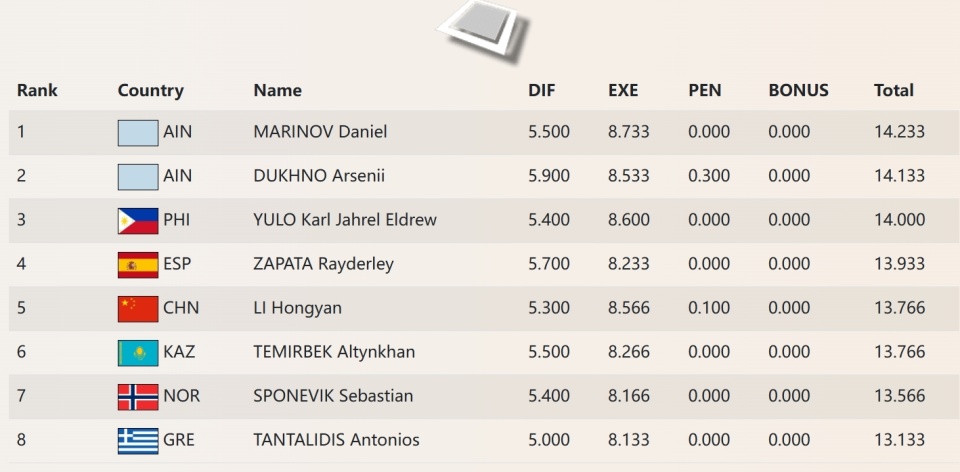 在三周前的安塔利亚站拿到银牌的哈萨克斯坦选手伊德里斯索夫,以14.566(5.8/8.766)再收银牌;巴黎奥运会银牌得主库尔巴诺夫难度达到6.0,出现了点小失误,也拿到和队友相同的14.566,通过平分打破,因为完成分低,排在第三位。
