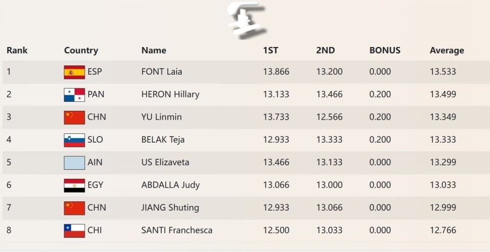 蒋淑婷只能完成难度4.2的尤尔琴科直体360以及4.4的冢原直体360,平均12.999排名第七。