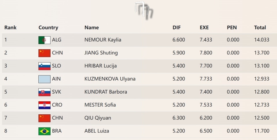 预赛排在第一的阿尔及利亚名将内穆尔,在并腿360-并掏特卡180时,因为摆动力量不够导致无法连接接下来的换杠,而因为握法的问题,她也不能马上屈伸上重新成到底,只能落下器械。