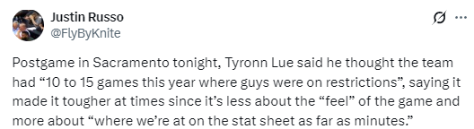 在谈到自己不会死按战术板执教的话题时,卢说道:“执教时很难完全照着战术板,会被各种出场时间限制绑死。之前的比赛就出过问题,本赛季我们至少有10到15场比赛,球员都有出场时间限制,不得不轮换换人,有时候球队刚从4分领先拉开到15分,核心球员就必须下场。所以执教根本不是死板按战术板来,更多是根据球员出场时间、数据情况灵活调整,想要每晚都一成不变地执行战术,其实很难做到。”
