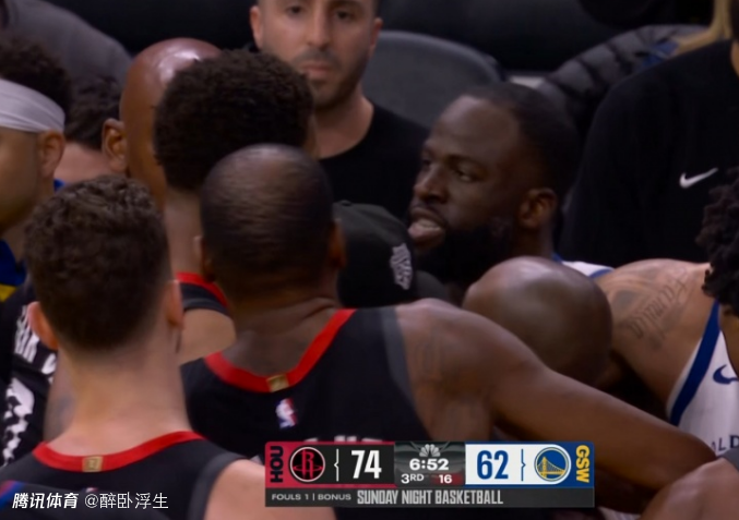 在第三节比赛进行到中段时刻,追梦格林接球后被小贾巴里-史密斯犯规,结果追梦格林先是用球砸向站在他面前的小贾巴里-史密斯,随后还主动走上去撞小贾巴里-史密斯的肩部。两人随即发生肢体纠缠与口角冲突,双方球员也是围拢上去制止事态进一步发展。