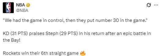 杜兰特在点评比赛时说道:“我们本已掌控比赛局面,结果他们派上了30号球员。本来比分已经拉开了,结果又被对手轻易追了回来。库里的投篮手感来得太快了,歇了几个月后状态看起来依旧不可思议。这确实是一场硬仗,不过赛季已经到了尾声,两支球队都在为季后赛做准备,所以这也是一次很好的考验。”
