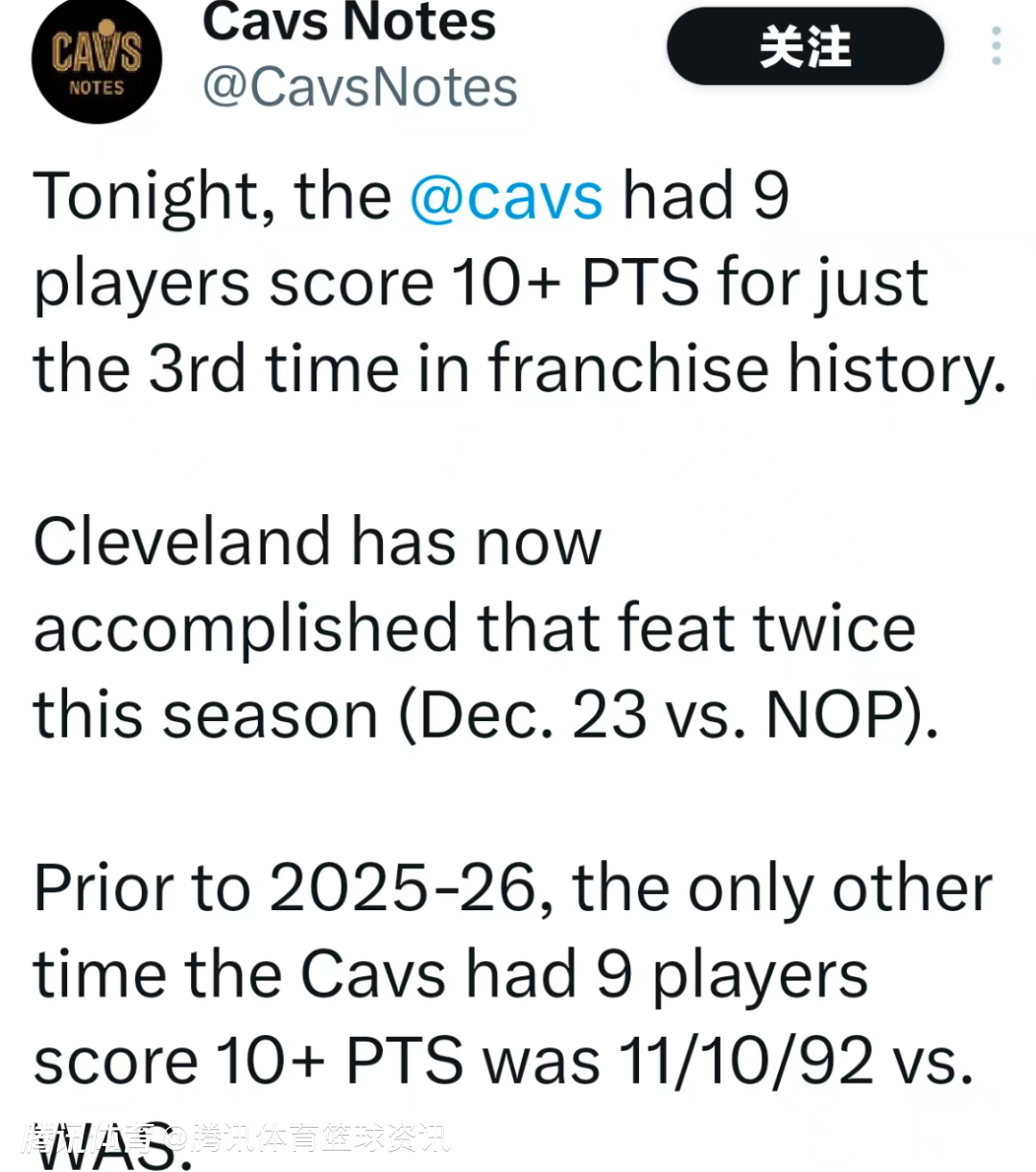 本赛季骑士已经两次做到这一点(上一次是12月24日对阵鹈鹕)。在2025-26赛季之前,骑士队史唯一一次9人得分上双,还要追溯到1992年11月11日对阵奇才。