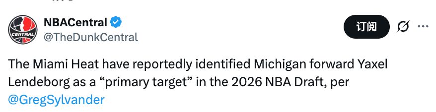 2026-04-07 23:20北京时间4月7日,据热火队记Greg Sylvander报道,迈阿密热火已将密歇根大学前锋亚克塞尔-伦德博格列为2026年NBA选秀的“主要目标”。