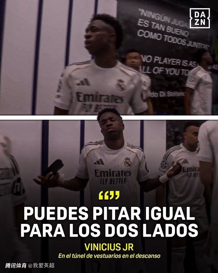 这也让巴西巨星十分不满,据悉,维尼修斯被摄像机捕捉到在中场休息的球员通道时向裁判抱怨:“你应该对两支球队进行公正吹罚。”
